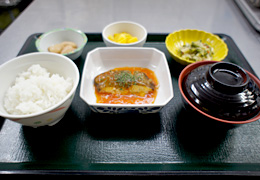 ごはん/すまし汁/カレイのチリソース煮/白花豆/花野菜サラダ/マンゴーフルーツ